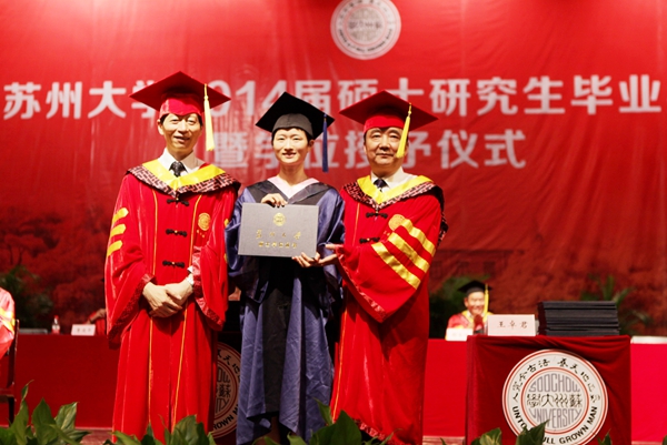 下午,2014届硕士研究生毕业典礼暨学位授予仪式在存菊堂隆重举行。校长朱秀林用“肩负责任、完善人格”、“脚踏实地、笃学不倦”、“国际视野、母校情结”三句话赠别硕士毕业生,希望他们秉承校训精神,争取更大的成就。