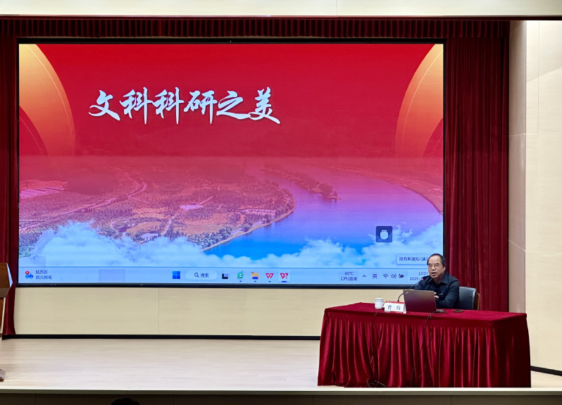 讲座开场,曹教授便直击“文科有科研么”这一“犀利”话题,并以这一话题为引子阐述了文科科研的特点。在讲述文科科研的具体体现时,曹教授从还原真相、探索未知、渡己与渡人、践行“横渠四句”、收获人生乐趣五个维度进行了阐释。他以研究上古音韵部为例,讲述了一场跨越千年的文科科研之旅:从宋代吴棫的《韵补》开研究先河,到现代王力在《汉语史稿》对上古韵30部的确立,众多学者历经千年的接力研究,不断精研细分,逐步实现科学分类,最终还原了古代音韵真相。曹教授还通过孔子“古之学者为己,今之学者为人”以及北宋理学家张载“为天地立心,为生民立命,为往圣继绝学,为万世开太平”的论述,指出文科科研在提升个人素养同时,也激励着文科科研工作者肩负传承文化、服务社会的重任。曹教授还结合自身科研经历,分享了在现代汉语词汇、词义、虚词等领域研究心得,直言在复杂的研究中虽常感艰难,但也沉醉其中,收获人生乐趣。