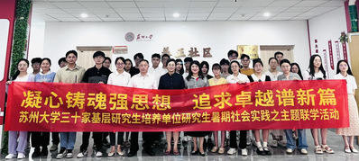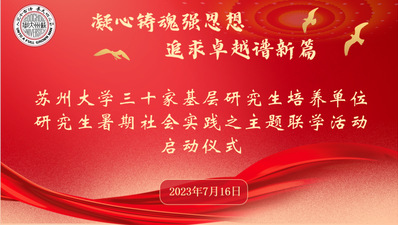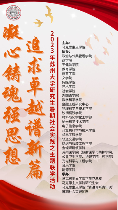 为学习贯彻党的二十大精神,进一步推动学习贯彻习近平新时代中国特色社会主义思想主题教育走深走实,响应苏州大学“学习二十大 永远跟党走 奋进新征程”暑期社会实践的号召,7月16日,苏州大学三十家基层研究生培养单位开展“凝心铸魂强思想 追求卓越谱新篇”研究生暑期社会实践之主题联学活动启动仪式暨第一场联合学习顺利举行。本次活动由马克思主义学院主办,二十九家基层研究生培养单位协办。