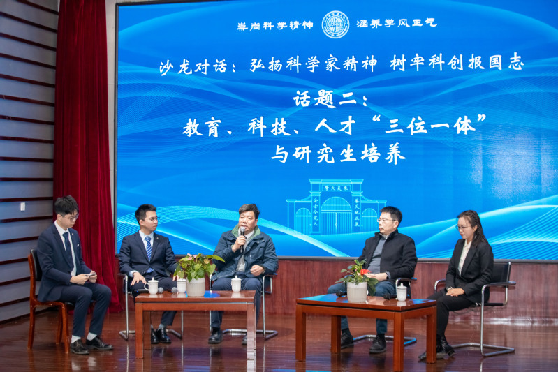 在“弘扬科学家精神,树牢科创报国志”沙龙对话现场,研究生院院长张进平教授、电子信息学院院长沈纲祥教授,第一届博士生宣讲团讲师杨乃霖、第三届博士生宣讲团讲师鲁坤焱、葛灿围绕“科研初心与科学家精神”“教育、科技、人才‘三位一体’与研究生培养”“产学研就融合与‘卡脖子’技术难题破解”等话题展开对话。本次沙龙对话氛围浓厚,不断碰撞思想火花,是一堂生动的对话梦想、导学传承、铸魂育人的思政公开课,深化了广大研究生对科学家精神的认识和理解,有助于青年科技工作者和新时代研究生在科研道路上弘扬科学家精神、坚守科学道德、矢志科创报国。