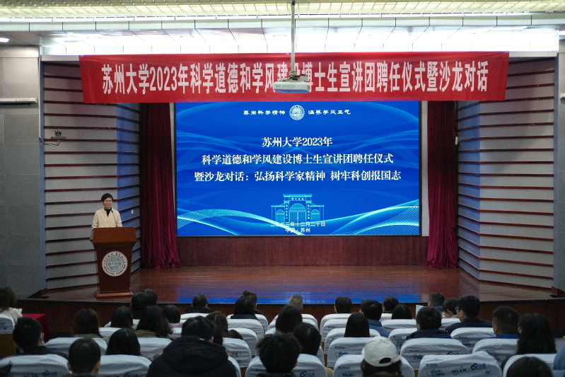12月20日下午,苏州大学2023年科学道德和学风建设博士生宣讲团聘任仪式暨沙龙对话在天赐庄校区学术报告厅举行。校党委常委、副校长查佐明出席活动并讲话,研究生院、党委研究生工作部、科学技术研究院、人文社会科学处等部门及校学术委员会秘书处负责人,《研究生学术诚信教育与管理》编委代表,2023年博士生宣讲团成员,各基层研究生培养单位分管负责人、研究生代表近200人参加活动。