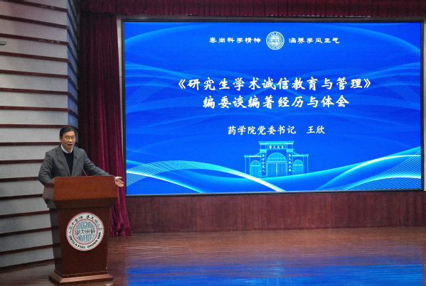 《研究生学术诚信教育与管理》编委代表、药学院党委书记王欣向同学们分享了编著经历与心得体会。他指出,真正的学术思维是随着科学发展而来的,要将科研伦理的规定融入到学风建设中。他希望宣讲团成员能够充分发挥朋辈教育的说服力与鲜活生命力,兼顾国际思维和历史思维,结合学科特点,运用鲜活的语言讲述学术诚信规则。