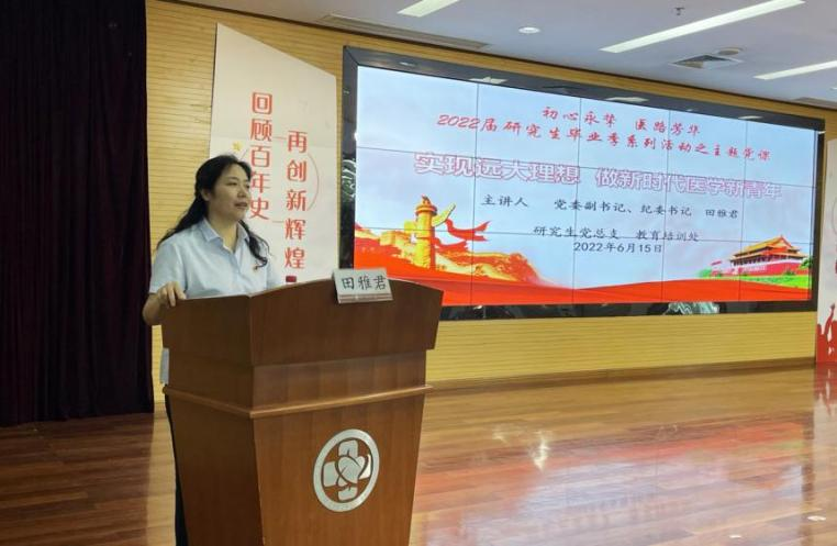 为引导广大医学生树立远大理想,提升自身实力,激发担当作为,6月15日下午,附属第二医院党委副书记、纪委书记田雅君以“实现远大理想,做新时代医学新青年”为主题,为毕业研究生带来了一堂生动的党课,这不仅是党性的教育,更是思想上的动员。本次党课是“初心永挚 医路芳华”2022届研究生毕业季系列活动之一,由研究生党总支书记李朝晖主持。