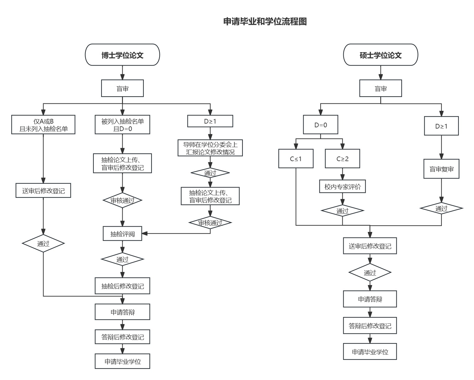 研究生须对照学位论文评审专家和答辩专家意见逐条对论文进行修改和完善,根据盲审实施办法和抽检管理办法相关要求,申请毕业和学位的前置流程须在我校研究生教育教学管理系统(以下简称“管理系统”)中进行,相关流程可参考《申请毕业和学位流程图》(附件1),具体要求如下: