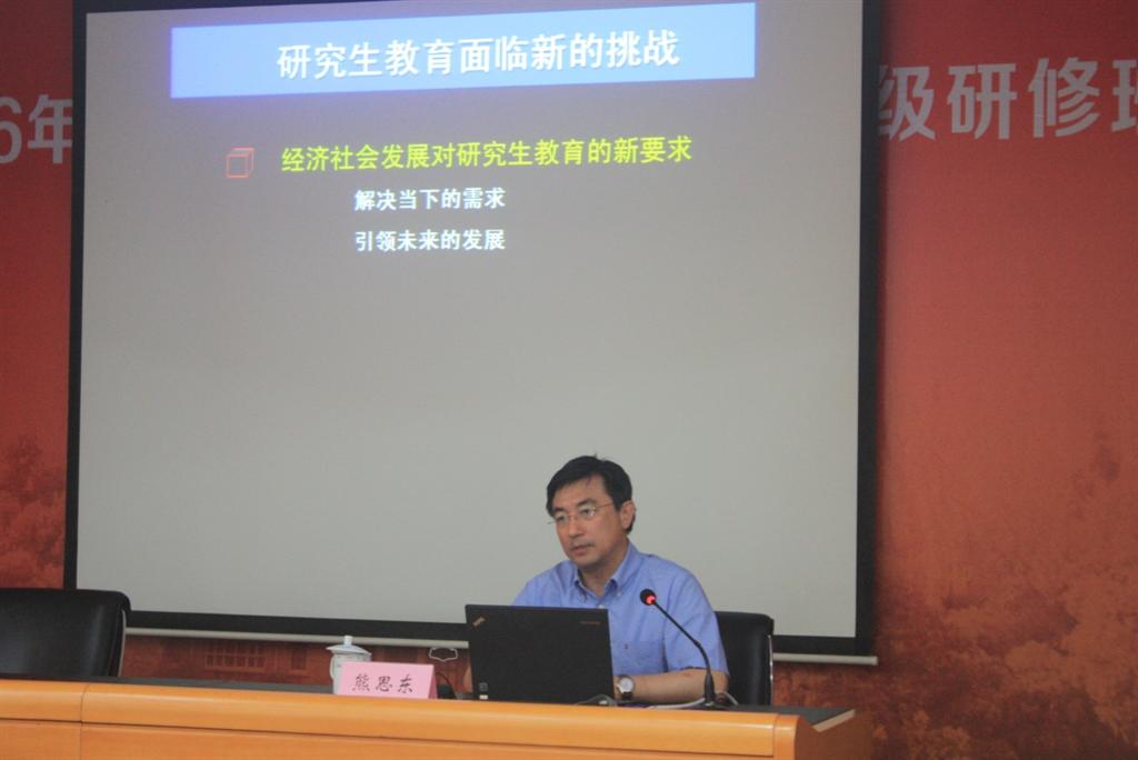 熊思东教授首先从当下经济社会发展对研究生教育的新要求、大众化本科教育对研究生教育的后发影响、研究生教育工具化色彩日浓之势等方面论述研究生教育面临的挑战,并且提出学校、学院和导师要深思为什么开展研究生教育,学生为什么要接受研究生教育,指出研究生教育根本目的是培养人才、科学研究和服务社会。