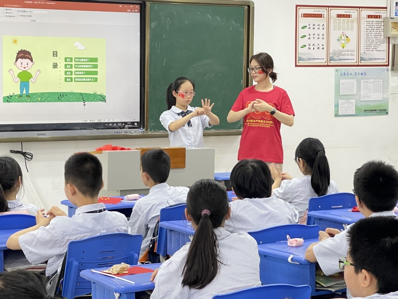 学党史践行“我为群众办实事”,讲述红色故事后,作为医学专业研究生的宣讲团成员们还结合专业特长为师生们普及手卫生小知识。“掌心对掌心;手心压手背;十指交叉摩;手握关节搓;拇指围轴转;指尖掌心揉;手腕别放过……”口诀朗朗上口,小学生们跃跃欲试,跟着大哥哥大姐姐们一遍遍实践。大学生们通过近距离演示,手把手教学,加强少年儿童良好卫生习惯的养成。